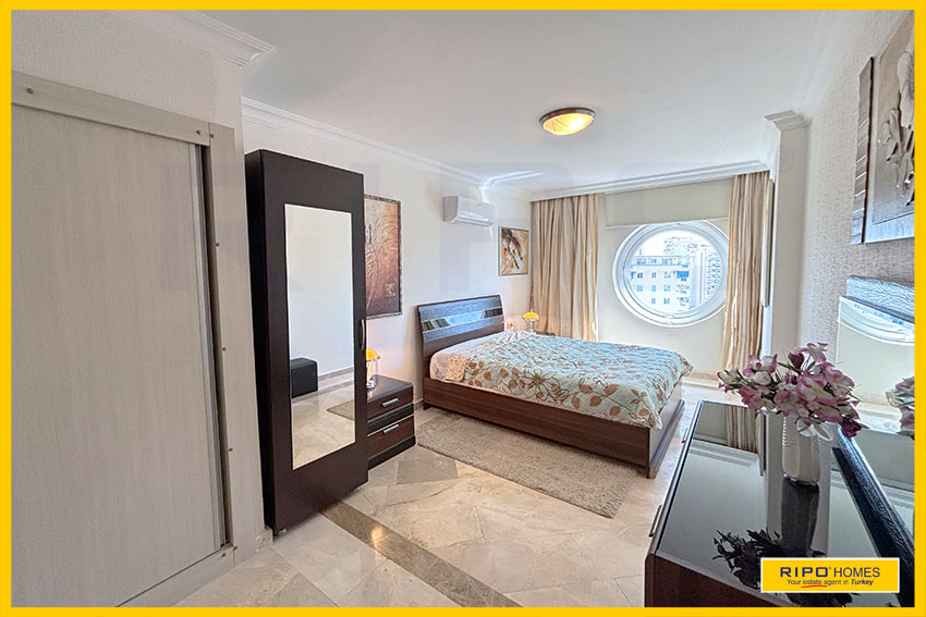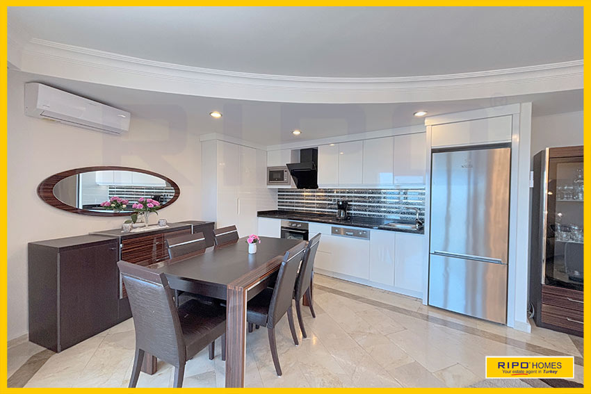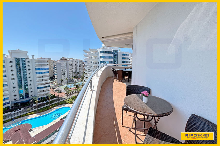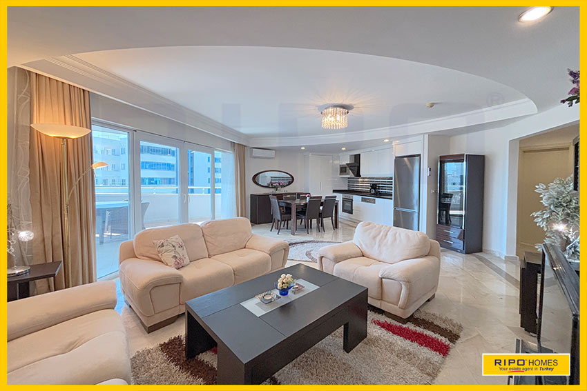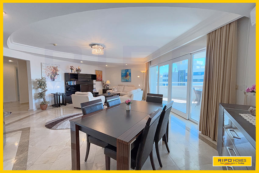 Отличная возможность приобрести впечатляющую 4-комнатную квартиру в Махмутларе, Аланья — всё необходимое рядом.Эта стильная, полностью меблированная квартира оформлена в современном дизайне с яркими художественными элементами. Площадь 150 м² создаёт атмосферу уюта и расслабления. Главное помещение — это просторная гостиная с открытой планировкой, оригинальным потолком и широкими дверями на балкон, откуда открывается вид на бассейн и окрестности. Компактная кухня в углу гармонично вписывается в интерьер, а обеденная зона удобно расположена рядом. В квартире есть большая прихожая с кладовой, семейная ванная комната и три просторные спальни. В главной спальне — красивое окно и собственная ванная комната.